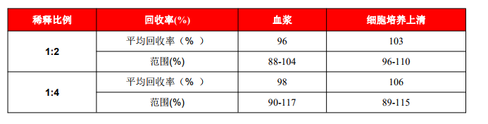在选取的健康人血浆、细胞培养上清中加入 3 个不同浓度水平的人 IL-5,计算回收率。