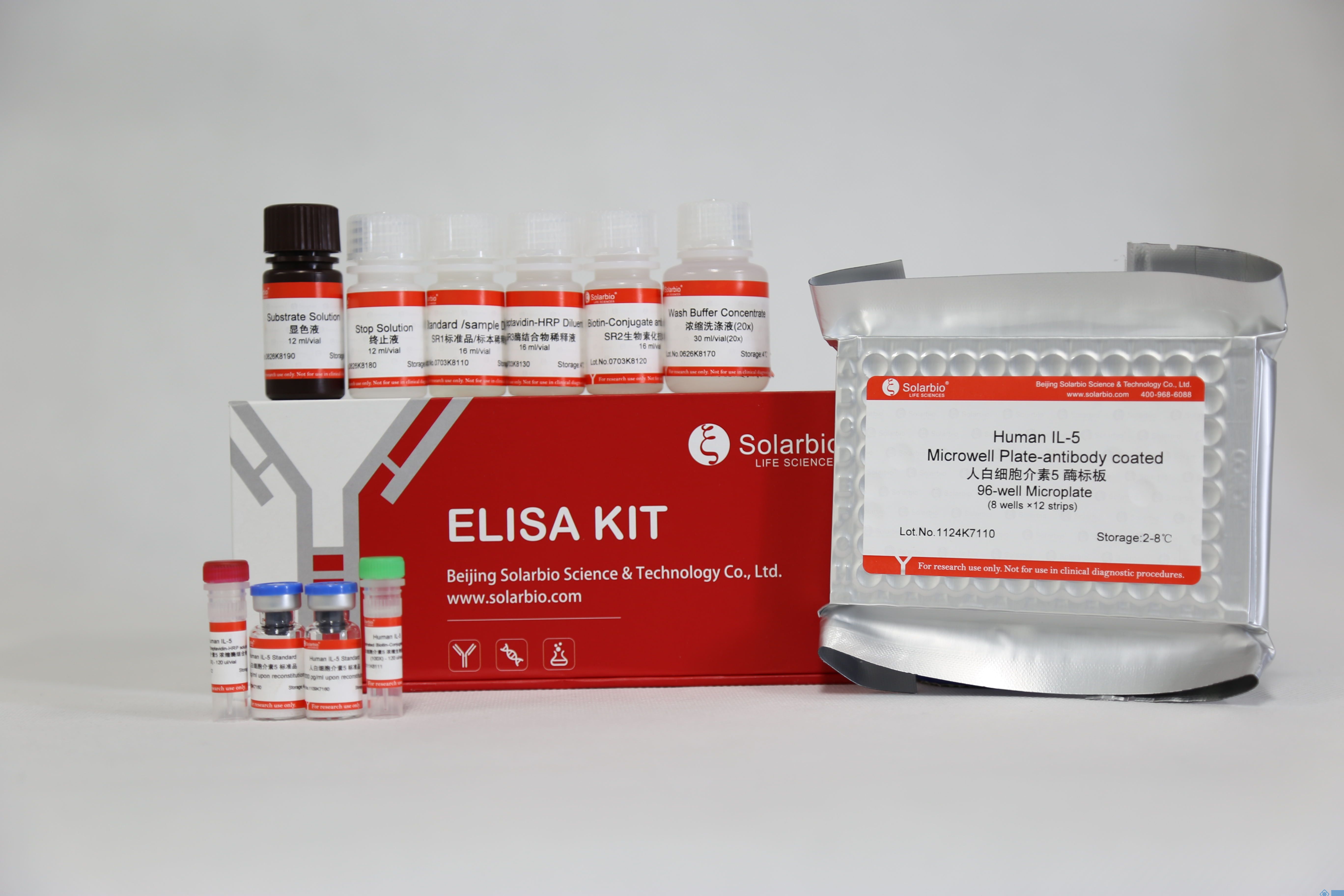 Solarbio (Solarbio ®) ELISA 试剂盒采用基于双抗体夹心法的酶联免疫吸附检测技术。将抗人 IL-5 单克隆抗体包被在酶标板上;分别加入梯度稀释的标准品和预稀释的样本,标准品和样本中的人 IL-5 会与酶标板上的包被抗体充分结合;洗板后加入生物素化抗人 IL-5 抗体,该抗体会与板子上包被抗体捕获的标准品和样本中的人 IL-5 发生特异性结合;洗板后加入辣根过氧化物酶(HRP)标记的链霉亲和素,生物素与链霉亲和素会发生高强度的非共价结合;洗板后加入显色剂底物 TMB,若反应孔中样品存在不同浓度的人 IL-5,则 HRP 会使无色 TMB 变成不同深浅(正相关)的蓝色物质,加入终止液后反应孔会变成黄色;最后,在λmax=450 nm(OD=450 nm)处测定反应孔样品吸光度(OD),样本中的人 IL-5 浓度与 OD 成正比,通过绘制标准曲线和四参数拟合软件便可计算出样本中人 IL-5 的浓度。