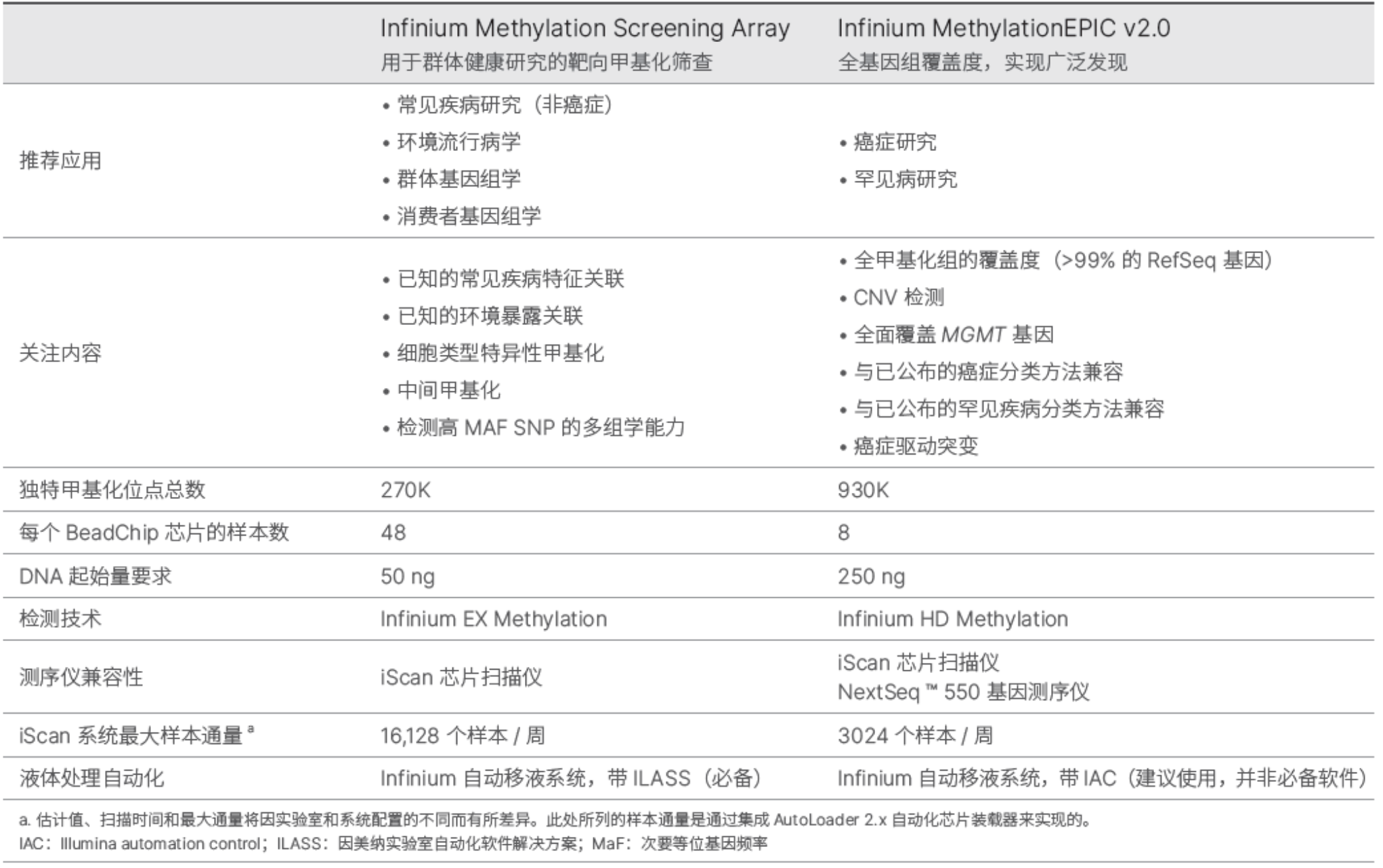 935K芯片延续了illumina 850K芯片经典的BeadArray技术,通过Infinium I及II探针设计,在对目标区域全面覆盖的同时也保证数据稳定可靠。Infinium I的设计是通过两种不同的探针的信号值来区分甲基化的CpG位点(C)和非甲基化的CpG位点(T)的比例;而在Infinium II的设计中,每个检测位点只设计一个探针,通过比较该探针掺入的两种荧光的信号值来计算目的位点的甲基化比例。270K芯片重点覆盖与常见人类特征、疾病表型、环境暴露、衰老等内容相关的 27 万个独特甲基化位点,使用48 个样本的 BeadChip 在单个 iScan ™芯片扫描仪上。专注设计和更高的样本通量让研究人员能够将 DNA 甲基化筛查应用于大型群体健康项目,发现疾病靶点。