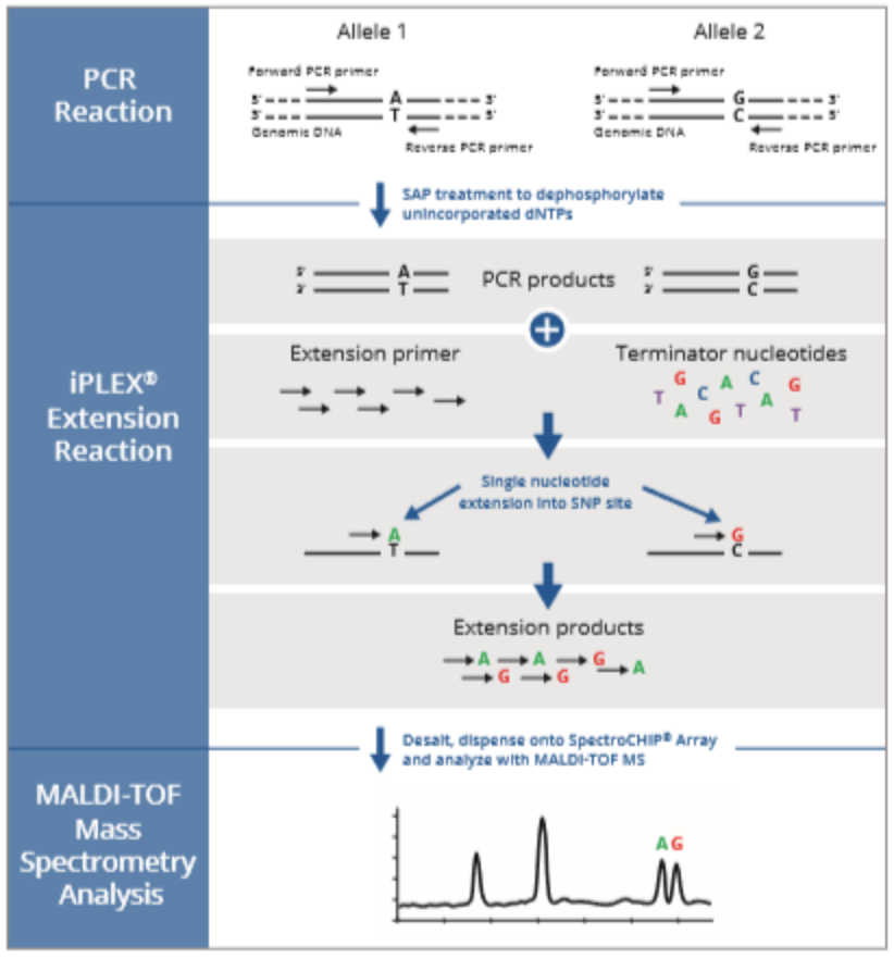 MassExtend单碱基延伸反应,紧挨SNP位点设计一段探针,在反应体系中以ddNTP替代dNTP,使探针仅在SNP位点处延伸一个碱基即终止。根据SNP位点的不同,探针将结合不同的ddNTP,从而具有不同的分子量,质谱仪即可检测出这种分子量差异,从而实现SNP分型的目的。